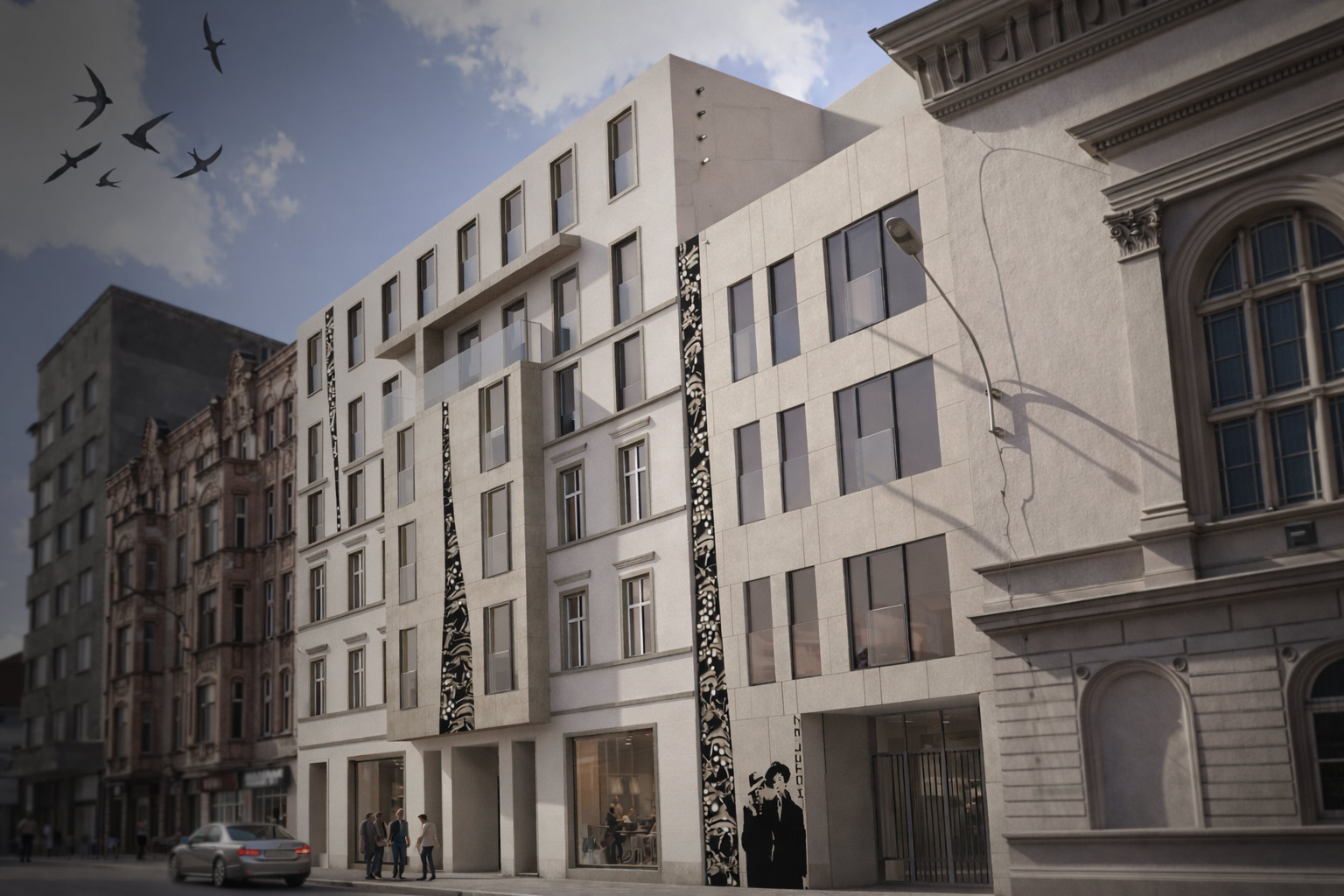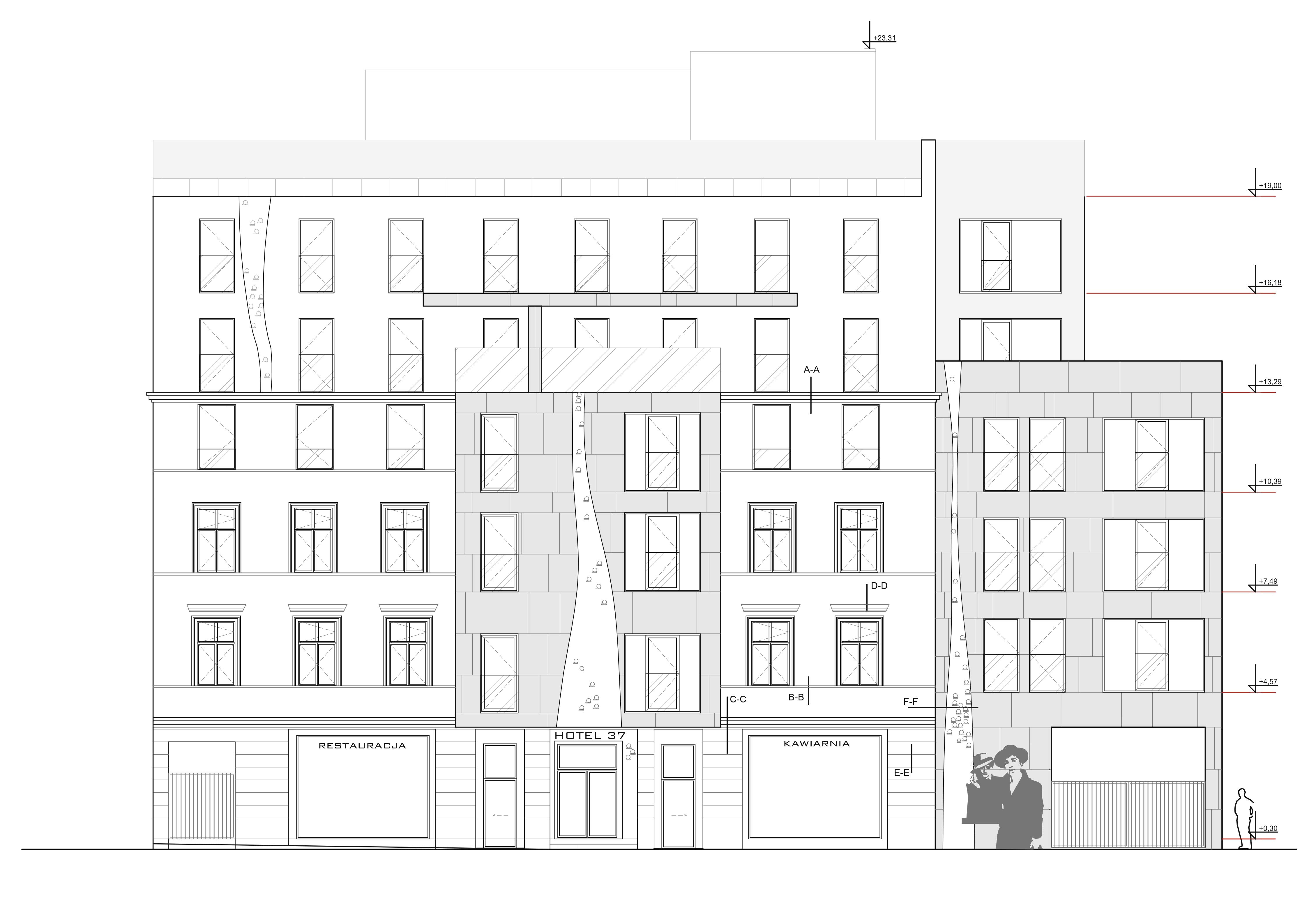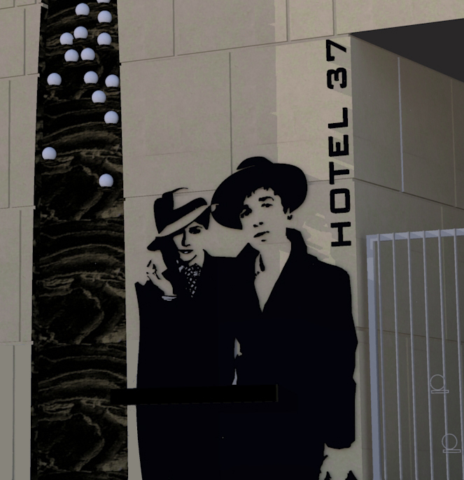 Bryła hotelu została ujęta współcześnie, w duchu architektury konceptualnej. Jej charakter budowany jest przez symbole, znaczenia i świadomie dobrane środki wyrazu. Szczególną rolę odgrywa grafika kobiety i mężczyzny umieszczona na barwionym szkle — subtelny znak elegancji, relacji i miejskiej wyrafinowanej atmosfery.