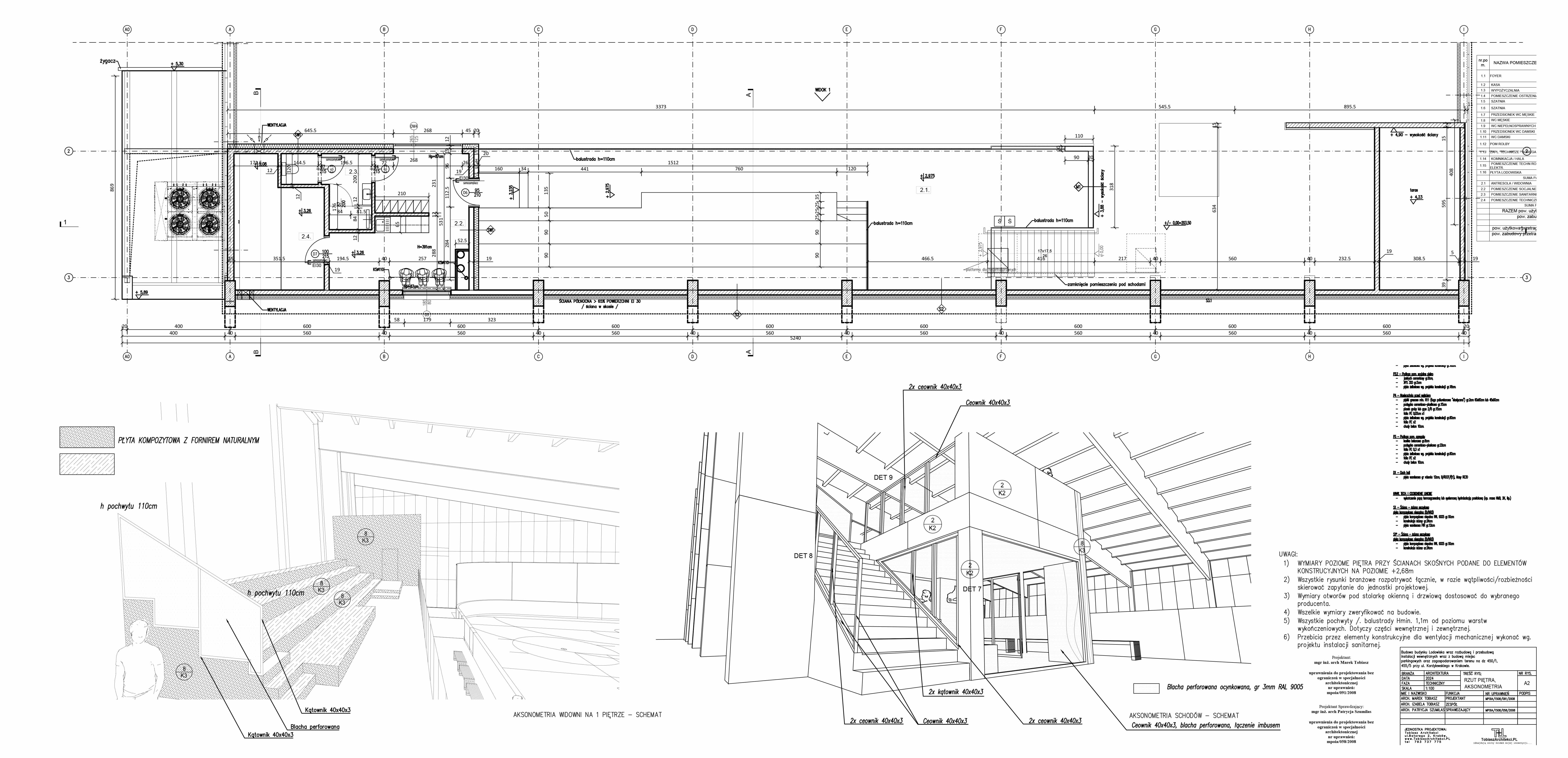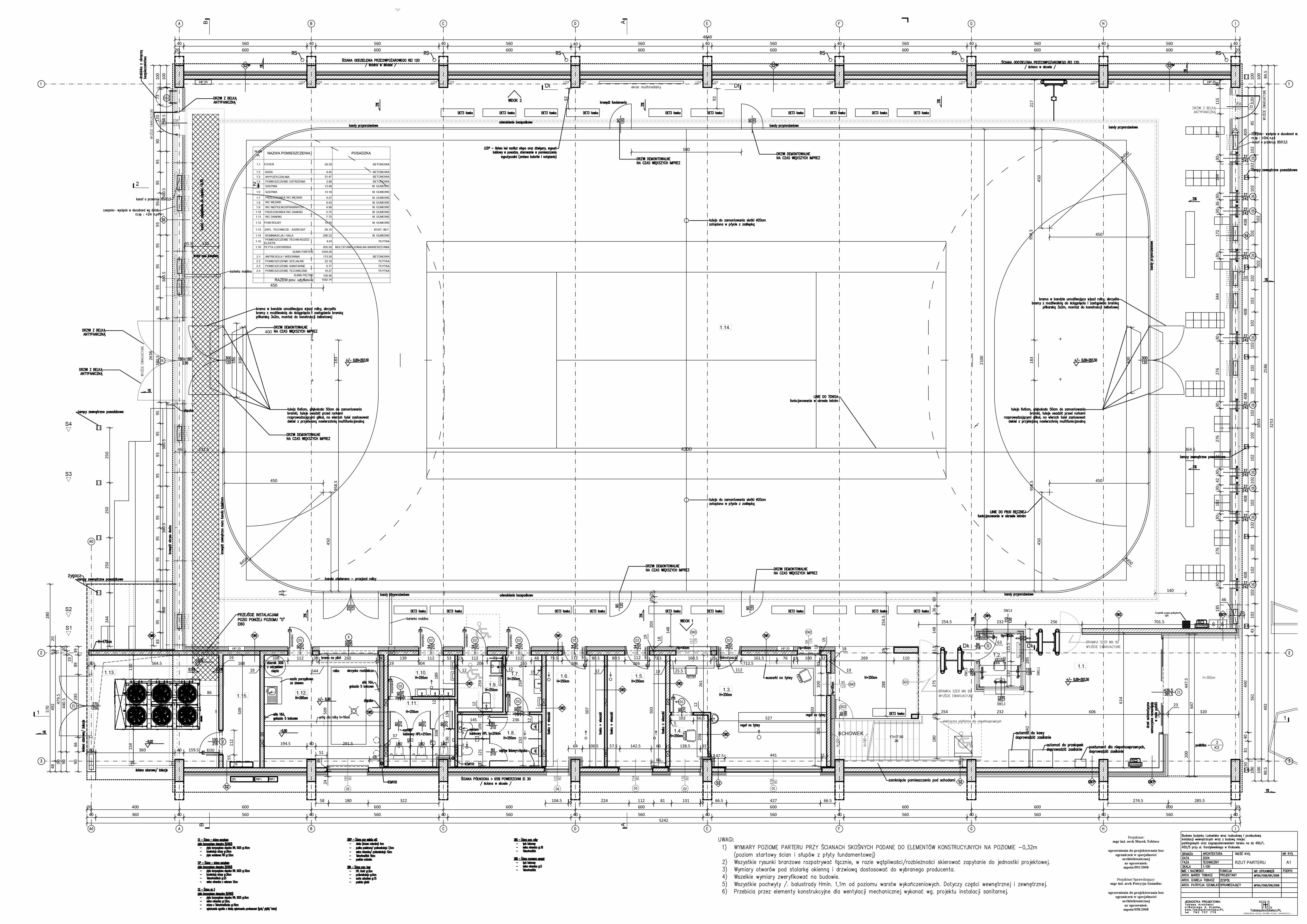 Podział obiektu na część zasadniczą (budynek) oraz część obudowaną (lodowisko) wynika ze specyfiki użytkowania i wymagań technicznych związanych z zapewnieniem odpowiedniego mikroklimatu dla powierzchni lodowej.